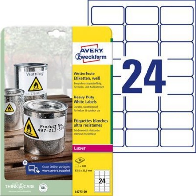 Etikett, 63,5x33,9 mm, poliészter, időjárásálló, AVERY ZWECKFORM, fehér, 480 etikett/csomag